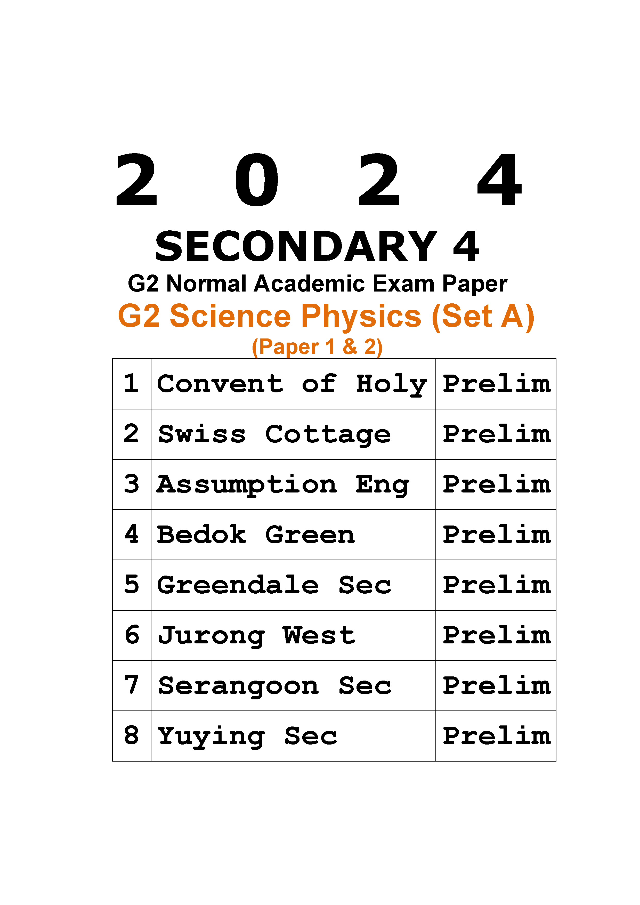 2024 Secondary 4 Sec 4 G2 Normal Academic NA Science Physics Prelim Exam Papers (Set A) (hardcopy)